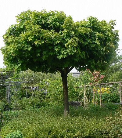 Der Kugel-Ahorn wird 7-10 Meter hoch und sollte sonnig bis halbschattig stehen. Die Blätter sind im Austrieb rotbraun, die Herbstfärbung ist gelb. |