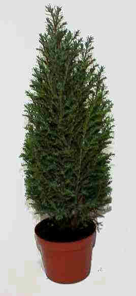 kegelförmige Scheinzypresse mit blaugrauen Nadeln. Sie wird nur etwa