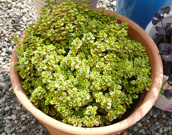 Zitronenthymian ist eine sehr dekorative Gewürzpflanze mit zierlichen, gelbgrünen Blättern. Die mehrjährige Pflanze wächst kissenartig und horstig. Sie benötigt einen trockenen und durchlässigen Boden. Der Standort sollte möglichst warm und sonnig sein. Bei Bedarf kann man die Pflanze nach der Blüte zurückschneiden. Das Laub des Zitronenthymians verbreitet einen herrlichen Zitronenduft. Man würzt mit den Blättern - frisch oder getrocknet - Fisch und Geflügel. Auch zu Gemüsen wie Kürbis oder Möhren passt er gut.