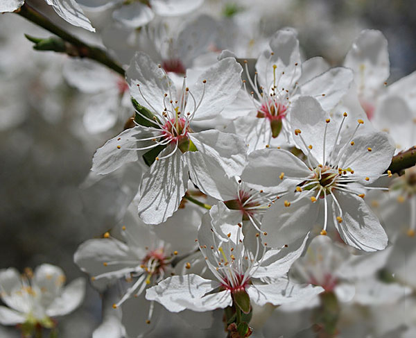 Die Wildpflaume - auch als Wilde Mirabelle oder Myrobalane bezeichnet - ist ein heimischer Strauch oder kleiner Baum. Er blüht weiß Ende März/ Anfang April vor dem Blattaustrieb. Ab August bringt er essbare Früchte hervor, die an Mirabellen erinnern.