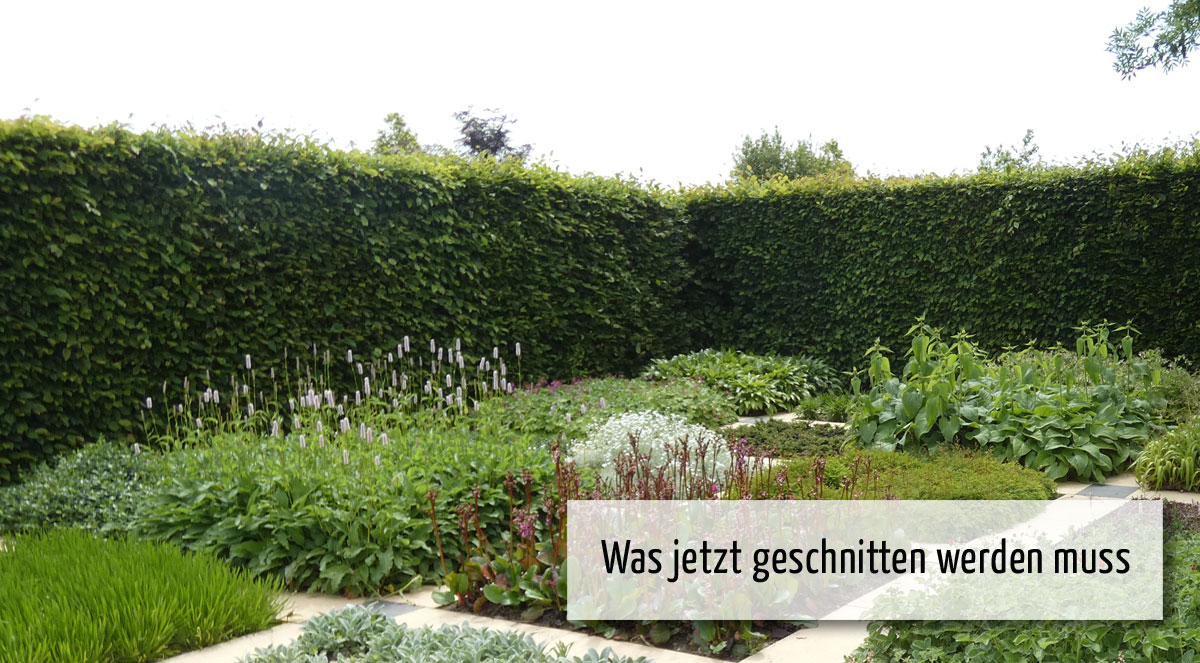 Der Sommerschnitt für Hainbuchen– und Ligusterhecken ist fällig. Auch bei anderen Hecken kann der an sich im Juni nötige Schnitt nun nachgeholt werden. Wenn die Hecken im unteren Teil kaum noch Blätter haben, verpassen Sie ihnen eine Pyramidenform, unten breiter als oben. Dann bekommen die unteren Äste genug Sonnenlicht, um auszutreiben.