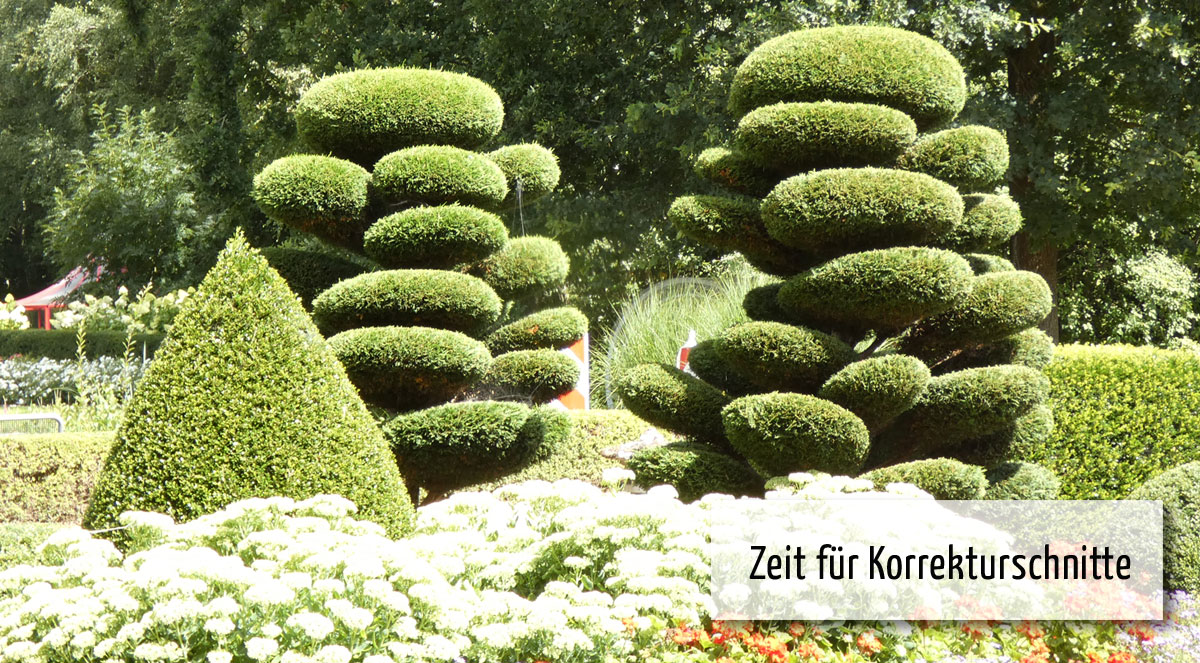 Gehölze, die an Schnitt gewöhnt sind, wie Eiben, Buchsbaum oder Liguster können auf diese Weise sogar in Formen gebracht werden, die eigentlich nicht in ihrer Natur liegen, wie etwa Kugeln, Kegel oder phantasievolle Skulpturen. Ende des Monats nach dem ersten Wachstumsschub sollten Sie die Konturen der Formgehölze nachschneiden.